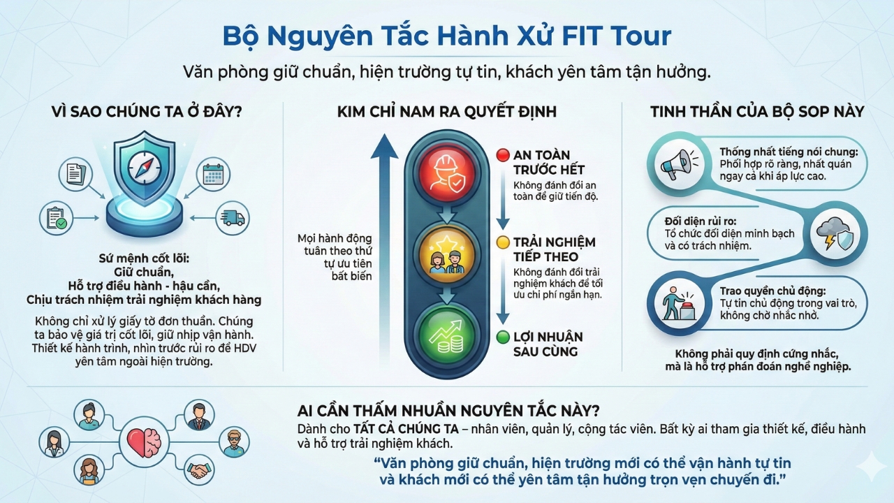 Trong hệ vận hành của FIT Tour, văn phòng chính là nơi bảo vệ giá trị cốt lõi và giữ nhịp cho toàn bộ đội ngũ. Chúng ta thiết kế cấu trúc cho hành trình, nhìn trước rủi ro để Hướng dẫn viên có thể yên tâm giữ trọn “linh hồn” của chuyến đi ngoài hiện trường.